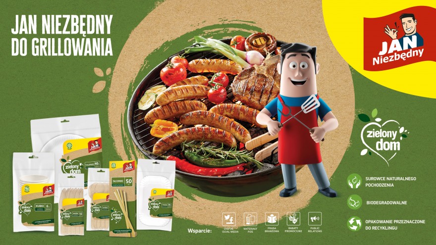 Wspólne grillowanie często odbywa się na wyjazdach i w warunkach piknikowych. Wtedy cennym wsparciem będą komplety naczyń i sztućców jednorazowych. Jan Niezbędny zachęca do korzystania z rozwiązań ekologicznych – zamiast plastikowych sztućców wybierzmy te drewniane. Zamiast plastikowych kubków i talerzy możemy wybrać te wykonane z papieru i z trzciny cukrowej. Specjalnie na takie okazje powstała linia jednorazowych naczyń Zielony Dom. Jan Niezbędny wierzy, że zmieniając przyzwyczajenia możemy chronić nasze środowisko. Linia Zielony Dom to produkty biodegradowalne, wykonane z surowców naturalnego pochodzenia, w opakowaniach przeznaczonych do recyklingu.