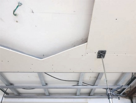 Na przykład przy całkowitym ciężarze zabudowy sufitu, tj. konstrukcji, izolacji i płyty, do 15 kg/m2 rozstaw wieszaków wynosi 1 m. Skomplikowany kształt i ciężka zabudowa wymagają ich większego zagęszczenia. Przy pomocy wieszaków, a dokładnie sprężyny do wieszaków kotwowych, regulujemy wysokość zawieszenia sufitu, dostosowując ją do istniejącej lub planowanej instalacji, np. klimatyzacji, wentylacji lub oświetlenia. Następnie montujemy profile główne CD do wieszaków kotwowych w odstępach i rozstawie określonym ich umiejscowieniem. Gdy rozstaw wieszaków wynosi 1 m, profil główny CD rozmieszczamy co 90 cm. Do profilu głównego CD montujemy profil nośny CD w rozstawie co 40 cm. Miejsca skrzyżowania obu profili CD łączymy łącznikiem krzyżowym do profili CDCD.
